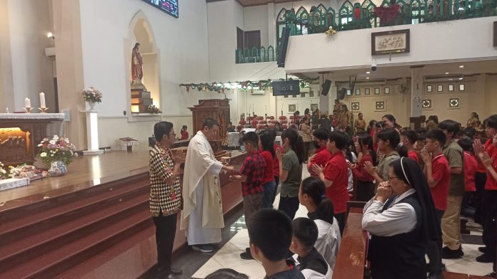 Dalam suasana yang khidmat dan penuh makna, anak-anak TK, SD, dan SMP Santa Clara mengikuti misa dengan antusias. RD Robertus Tri Budi Widyanto, atau Romo Udith, menjadi pembicara dalam misa tersebut, mengupas Firman Tuhan dari Yohanes 1:1-18.